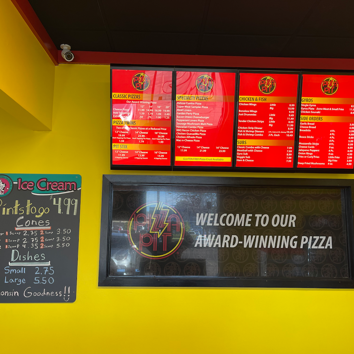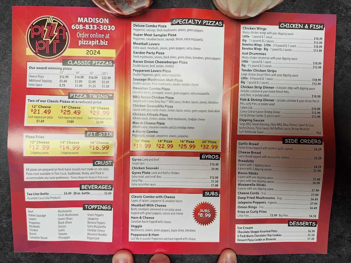 The menu at Pizza Pit - Madison West offers a variety of satisfying dishes that cater to different tastes. Appetizers such as Garlic Bread, Cheese Bread, and Mozzarella Sticks start the meal off on a delicious note. The restaurant's classic pizzas come in multiple sizes, from the Medium 12" to the Mega 20", and a variety of toppings can be added for an extra cost, allowing customers to customize their meal. For those seeking more value, the Pizza Twins offer a great deal with two medium, large, or extra-large cheese pizzas. Specialty pizzas like the Deluxe Combo Pizza and Super Meat Sampler Pizza provide more hearty options, while the Bacon Onion Cheeseburger Pizza offers a unique twist. For a protein-packed choice, the chicken and fish options like Chicken Wings - Little Dipper and Boneless Chicken Wings are available in various sizes. The Athens Gyros section offers flavorful options like the classic Athens Gyro and Chicken Gyro, with extra pita or cucumber sauce for those who want to personalize their dish. Subs like the Classic Combo w/ Cheese or Meatball with Cheese serve as satisfying alternatives. For dessert, treat yourself to a 6-Pack Warm Chocolate Chip Cookies or an 8" Brownie, and wash it down with refreshing beverages like Barqs Root Beer or Cherry Coke. This diverse menu ensures there’s something for everyone, whether you're in the mood for a quick snack or a full meal.
